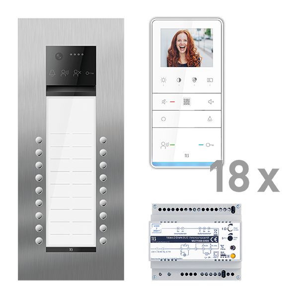 Vorkonfiguriertes Video Paket für 18 Wohneinheiten für den TCS:BUS bestehend aus: 1x PES PRO Video Außenstation 18T UP ES, Artikelnummer: AVU600218-0030, vorprogrammiert, 18x TASTA PRO Video Freisprecher 3,5" AP WS, Artikelnummer: IVW6511-0145, 1x Video-2-Draht:BUS Versorgungsgerät, Artikelnummer: NVV1000-0400. Das Paket ist ab Werk vorkonfiguriert und bedingt erweiterbar. Die Funktionen der Innen- und Außenstationen können mit TCS-Serviceprodukten bedingt verändert werden.