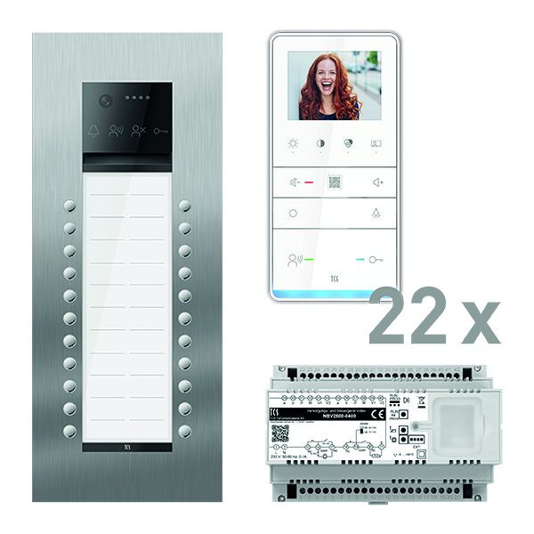 Vorkonfiguriertes Video Paket für 22 Wohneinheiten für den TCS:BUS bestehend aus: 1x PES PRO Video Außenstation 22T UP ES, Artikelnummer: AVU600222-0030, vorprogrammiert, 22x TASTA PRO Video Freisprecher 3,5" AP WS, Artikelnummer: IVW6511-0145, 1x Versorgungs- und Steuergerät Video 8 TE, Artikelnummer: NBV2600-0400. Das Paket ist ab Werk vorkonfiguriert und bedingt erweiterbar. Die Funktionen der Innen- und Außenstationen können mit TCS-Serviceprodukten bedingt verändert werden.