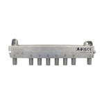 6-fach Abzweiger 5-2400 MHz im Gußgehäuse mit Wandabstand und F-Anschlüssen. Eingänge und Ausgänge auf einer Seite, dadurch weniger Platzbedarf, DC-Pass auf der Stammleitung, Abzweige DC entkoppelt. AD: 20 dB, DD: 1,5/1,5 dB