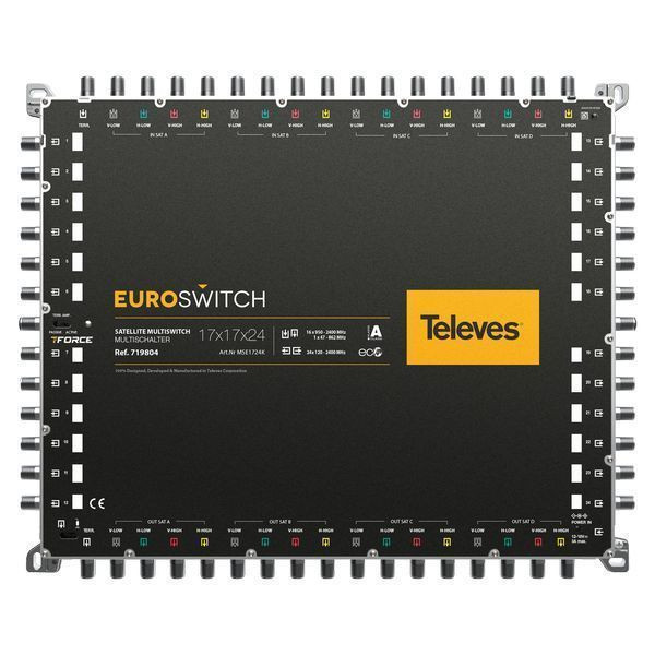 Kompakter Multischalter mit 17 Eingängen (1 x Terrestrik und 16 x SAT) und 8 Teilnehmerausgängen. Sehr geringe Durchgangs- und Abzweigdämpfung aufgrund seiner Konstruktion. Dadurch kann die in einer Kaskade benötigte Anzahl an Verstärkern reduziert werden ohne die Signalqualität zu beeinträchtigen, selbst in großen Installationen. Einsatz als Einzelschalter (Sterntopologie) oder als Kaskadenschalter. Zusätzlich kann die TForce-Technologie aktiviert werden, damit das terrestrische Signal automatisch anpasst und trotz Empfangsschwankungen konstant bleibt. 12-18V-Stromversorgungsbereich. Ausgestattet mit der TForce-Technologie, dadurch wird der terrestrische Ausgangspegel (TERR. AMP. ACTIVE) automatisch auf den optimalen Pegel eingestellt. 100% europäisches Design, Qualität und Herstellung.
