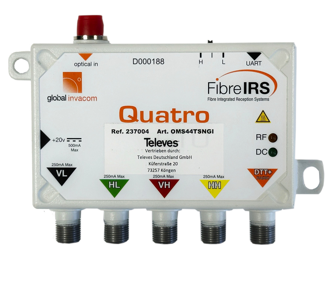 Der optischer QUATRO - Umsetzer wandelt das vom LNB über ein LWL-Kabel kommende Signal 950 - 5450 MHz in ein Standard-Satelliten-Signal im Bereich 950 - 2150 MHz.Der Quatro-Umsetzer hat 4 Ausgänge für die Sat-Ebenen vertikal und horizontal low, vertikal und horizontal high sowie einen terrestrischen Ausgang, geeignet zum Anschuss von Multischalter und Kopfstellen. Können diese Geräte keine Spannungsversorgung herstellen wird das Netzteil OMS12NT benötigt.
