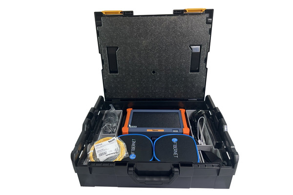 L-BOXX Koffer (Art.-Nr. 598050) mit verschiedenen Zubehörteilen für die Messung von Singlemode (SM) und Multimode (MM) Glasfaserstrecken mit dem OTDR PRO (Art.-Nr. 598002). Startfaser für die OTDR-Messung, gepanzert, Multimode (MM) OM2 SC/PC-LC/PC, 150 m (Art.-Nr. 230990) Duplex-Glasfaser-Pigtail LC/PC – SC/PC, Multimode (MM) OM4 (Art.-Nr. 230931) Glasfaser-Pigtail LC/UPC – SC/APC, Singlemode (SM) (Art.-Nr. 232627) Glasfaser-Pigtail LC/APC – SC/APC, Singlemode (SM) (Art.-Nr. 232628) Optischer Adapter SC Buchse – SC Buchse Simplex Singlemode (SM), mit interner Verschlusskappe (Art.-Nr.: 233205) Optischer Adapter LC Buchse – LC Buchse Duplex Multimode (MM) OM2 (Art.-Nr. 233213) Optischer Adapter LC Buchse – LC Buchse Duplex Singlemode (SM) (Art.-Nr. 233216) One-Click-Reiniger für F.O.-Stecker 2,5 mm: SC, ST, FC, E2000 One-Click-Reiniger für F.O.-Stecker 1,25 mm: LC, MU