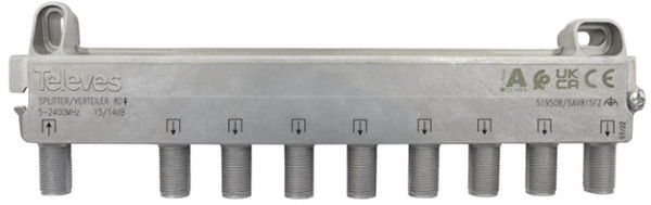 8-fach Verteiler 5-2400 MHz im Gußgehäuse mit Wandabstand und F-Anschlüssen. Eingänge und Ausgänge auf einer Seite, dadurch weniger Platzbedarf, brummentkoppelt, DC-Pass Ausgang. -> Eingang. Verteildämpfung 14dB