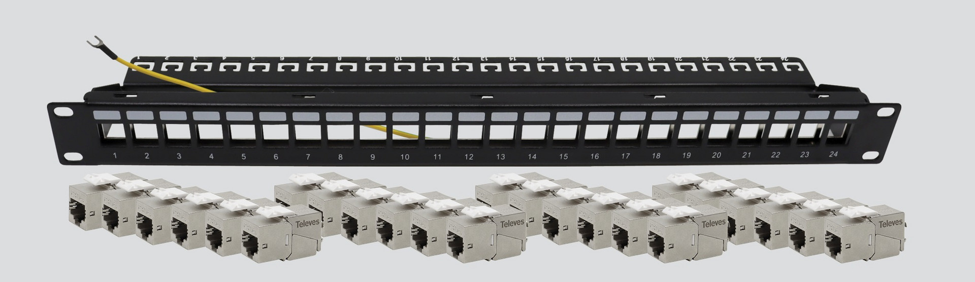 Das Panel mit Erdungsanschluss ist mit 24 x RJ45 Keystone Module CAT6AB-S bestückt und kann als Anschlusspunkt (Daten-Patchpanel) verwendet werden. Seine Verwendung er- möglicht ein festes Datenverteilungsnetz an einem zentralen Punkt zu verwalten. Mit Patch- kabeln kann das vorhandene Signal, z.B. von einem Switch, schnell und übersichtlich den einzelnen Ports zugeordnet werden. Eine Zugentlastung verhindert, dass sich Kabel in den Anschlussbuchsen durch ihr Eigengewicht, Zug bzw. hantieren an den Kabeln lösen.