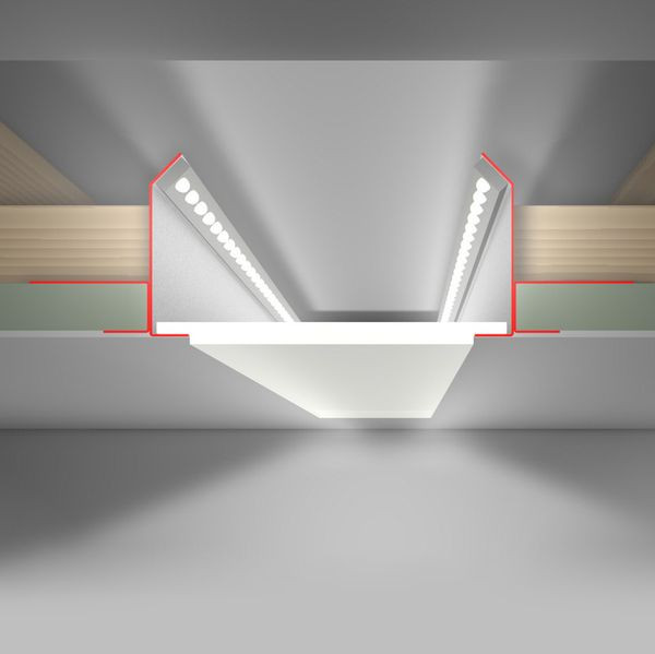 Deckeneinbauprofil für breite Lichtfelder in speziell angepassten Längen mit direktem Licht. Höhe über Putz: 40/50 mm.