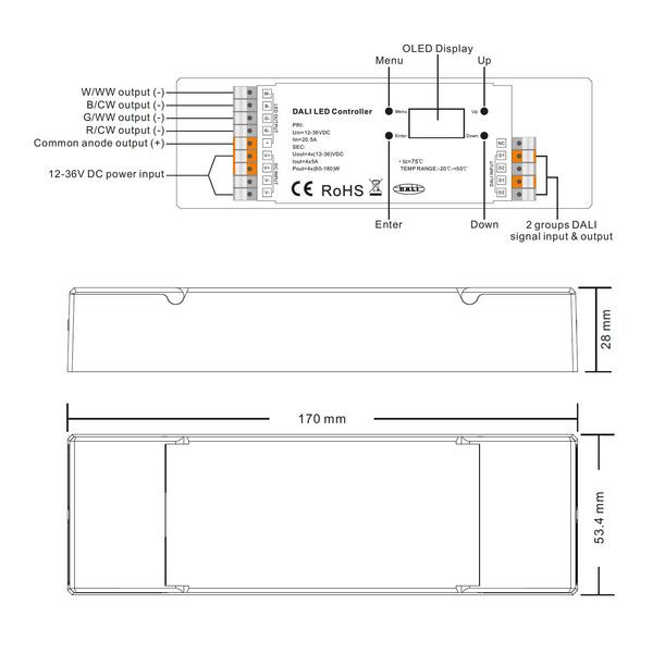 | Kurzbeschreibung | DALI DT8 Dimmer, 4 Kanäle PWM-Ausgang, integrierte DALI-Master-Funktion. OLED-Display, schnelle Installation, einfache Steuerung über DALI-Adresse. |
