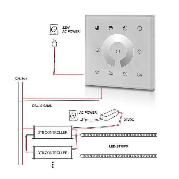 | Kurzbeschreibung | Berührungsgesteuertes DALI-Glas-Bedienfeld mit 100mA Netzteil für bis zu 50 EVG. Stromversorgung über DALI-Bus oder Netzanschluss. |