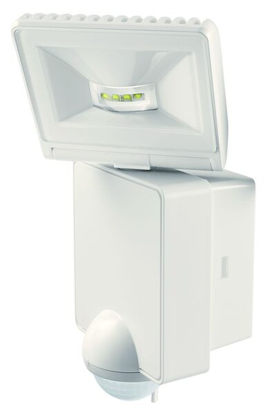 1 LED Strahler 8 W (entspricht ca. 100 W Halogenstrahler) mit Bewegungsmelder für Wandmontage; ± 40° dreh- und 90° schwenkbarer Sensorkopf; Erfassungsbereich 90°; Reichweite 10 m (Montagehöhe 2,5 m); zusätzlicher 140° Unterkriechschutz mit Radius 2 m; Bereichseingrenzung durch Linsenaufsatz; Innen- oder Außenmontage (IP 44); automatische Schaltung helligkeits- und bewegungsabhängig oder Dauerschaltung; Mischlichtmessung ca. 5...200 lx; Einschaltdauer 5 s...10 min; Gehäuse 8x18x6 cm; Stecksockel; inkl. Schrauben und Dübel; Stand-by 0,3 W 1 LED Strahler 8W (entspricht 100 W Halogenstrahler) mit Bewegungsmelder für Wandmontage, +-45° dreh-und 90° schwenkbarer Sensorkopf, zusätzlicher 140° Unterkriechschutz mit Radius 2 m, Bereichseingrenzung durch Linsenaufsatz, Innen-oder Außenmontage (IP44), automatische Schaltung helligkeits-und bewegungsabhängig oder Dauerschaltung, Mischlichtmessung, Gehäuse weiß 8x18x6 cm, Stecksockel, inkl. Schrauben und Dübel