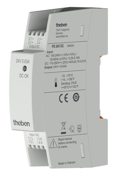 Primär getaktete Spannungsversorgung 24 V DC, 0,63 A, Zur Spannungsversorgung von 24V-Geräten, beispielweise der 24V-Versionen der Meteodata 140 S KNX, Baubreite 1 TE, Weitbereichseingangsspannung (100-240 V AC / 110-250 V DC), Push-In Steckklemmen (doppelte Anschlüsse, 45° Winkel), Höchste Energieeffizienz in Leerlauf- und Teillastbetrieb (Efficiency Level VI)