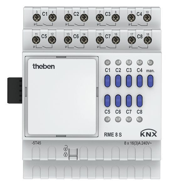 kombinierbar auch mit RMG 4I KNX Schaltaktor Erweiterungsgerät mit Relaisausgängen für 8 Schaltkanäle, erweiterbar mit RME 8 S oder mit anderen MIX-Erweiterungsgeräten, Reiheneinbaugehäuse Breite 4 TE, C-Last, Grundgerät und Busankopplung sind mechanisch trennbar und können unabhängig voneinander getauscht werden. LED Schaltzustandsanzeige für jeden Kanal, Handschalter mit Statusanzeige (auch ohne Busspannung), Verknüpfungen, Kontaktart (Öffner/Schließer) und Teilnahme an Zentralbefehlen wie Dauer-Ein, Dauer-Aus, Zentral-Schalten und Szene speichern/abrufen, Schaltfunktionen: Ein/Aus, Impuls, Ein/Aus-Verzögerung, Treppenlicht mit Vorwarnen nach DIN 18015-2, logische Verknüpfungen: Sperren, UND, Freigeben, ODER. Rückmelde-Objekt für jeden Kanal, Zentral-Objekte mit und ohne Priorität, Szenen abrufen und speichern (Objekt), Szenenobjekt für jeden Kanal