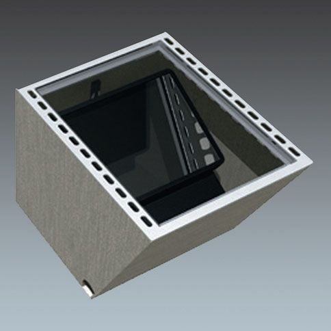 Bodeneinbaugehäuse mit integriertem Abflusszugang sowie Schienen zur Flutermontage und Positions-/Winkeleinstellmöglichkeiten. Lange Lebensdauer dank hoher Tragfähigkeit und einfacher Montage. Ausschließlich begehbar. Gehäuse: verrottungsfester Faserzement, Rahmen und Schrauben: Edelstahl, Glas: gehärtet 2x10mm. IK09. Montage: Öffnungen mit Durchmesser 70 mm für Netzanschluss und Abfluss. Eine stabile und effiziente Bodenbeschaffenheit für den Abfluss sicherstellen. Contrast wird mit HH M10-Edelstahl-Schrauben an der Schiene an der vertikalen Seite befestigt. Befestigung des Glases mit HSHC M6 Edelstahlschrauben. Einbaugehäuse speziell für Contrast groß Abmessungen: 650 x 530 x 470 mm Gewicht: 44 kg Maximale Auflast: 2500 kg. Basierend auf Bruchpunkt für Glas.