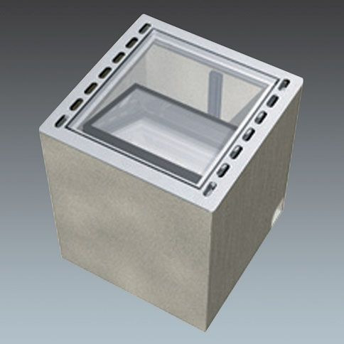 Bodeneinbaugehäuse mit integriertem Abflusszugang sowie Schienen zur Flutermontage und Positions-/Winkeleinstellmöglichkeiten. Lange Lebensdauer dank hoher Tragfähigkeit und einfacher Montage. Ausschließlich begehbar. Gehäuse: verrottungsfester Faserzement, Rahmen und Schrauben: Edelstahl, Glas: gehärtet SECURIT 10mm. IK09. Montage: Öffnungen mit Durchmesser 70 mm für Netzanschluss und Abfluss. Eine stabile und effiziente Bodenbeschaffenheit für den Abfluss sicherstellen. Contrast wird mit HH M10-Edelstahl-Schrauben an der Schiene an der vertikalen Seite befestigt. Befestigung des Glases mit HSHC M6 Edelstahlschrauben. Einbaugehäuse speziell für Contrast Midi Abmessungen: 400 x 400 x 450 mm Gewicht: 22 kg Maximale Auflast: 1500 kg. Basierend auf Bruchpunkt für Glas.