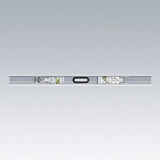 Zentrale elektrische Zuleitung, L750 in weiß, aus rollgeformtem Stahlblech für den mittigen Stromanschluss oder zur mittigen Lastverteilung der Tragschiene. 2 Sets mit Steckklemmen für 5 Netzleitungen, 2 x 2 Notlichtleiter und 2 Steuerleitungen. Berührungsschutz für stromführenden Bereich. Zur Abdeckung der zentralen Contus Zuleitung können die Enden von zwei Contus Leuchten dienen, die mindestens 1000 mm lang sind, oder zwei Abdeckstreifen. Das Speisegerät in der Mitte wird zusammen mit zwei Tragschienenendkappen geliefert. Abmessungen: 750 x 60 x 54 mm Gewicht: 1,45 kg