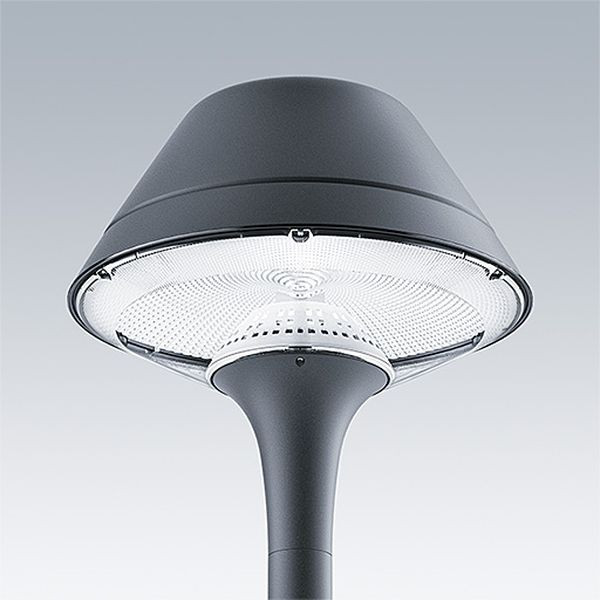Plurio Indirekt: Eine dekorative LED-Leuchte zur Mastaufsatzmontage. Lichtverteilung: radial symmetrisch. LED-Treiber mit 24 LEDs, betrieben bei 250mA. Schutzklasse I, IP66, IK08. Sockel: Aluminium, gegossen, pulverbeschichtet in THORN DUNKELGRAU, strukturiert, (ähnlich DB 703 / AKZO 900). Leuchtengehäuse: Orginalform, Aluminium, texturiert in THORN DUNKELGRAU, strukturiert, (ähnlich DB 703 / AKZO 900). Diffusor: Polycarbonat (PC), klar, UV-stabilisiert, mit Blendschutzprismen. Indirekte, auf dem Reflektor basierende Optik.Ausgestattet mit 50% Leistungsreduktionsschaltung, aktiviert 3 Std. vor und 5 Std. nach einer berechneten Mitternacht. Kann bei der Installation mit einem leicht zugänglichen internen Schalter bzw. Kabel-Klemme deaktiviert werden. Inklusive LED-Modul mit 4000K. Mastaufsatzmontage auf Durchmesser 60mm Mastzopf Streulichtemissionen von unter 1 %. Abmessungen: Durchmesser 564 x 567 mm Leuchten Leistung: 19 W Leuchten Lichtstrom: 2416 lm Leuchten Lichtausbeute: 127 lm/W Gewicht: 9,5 kg Windangriffsfläche: 0.199 m²
