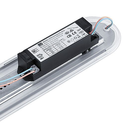 IP65 LED-Feuchtraumleuchte mit opalem Diffusor für Innen- sowie überdachte Außenmontage. Innovatives Design mit extralangen Montageschiebern (300 mm) für einfache Montage, daher ideal für Renovierungen. Das Design aus hochwertigem Polykarbonat (UV-stabilisiert) ist schlicht und schellenfrei und bietet dennoch einfachen, aber sicheren Zugang zum Treiber. Gesamtlichtstrom: 4200 lm, Leuchten Leistung: 34 W, Leuchten Lichtausbeute: 124 lm/W, CCT: 4000K, Lebensdauer: 50.000h bei L80, Farbwiedergabe: CRI > 80. Farborttoleranz (initial MacAdam): 4 Schlagfestigkeit: IK08. Werkzeuglose Montage, BESA-kompatibel. Zubehör: Plug&Play Notlichtset für 3 Stunden Notlichtbetrieb (Selbsttest und manueller Test) sowie Aufhängung. Lumenpaket vor Ort verstellbar in 3 Schritten (Flex 1: 4200 lm (34W), Flex 2: 3200 lm (25W), Flex 3 2200 lm (18W). Genaue Informationen zur Leistungseinstellung auf www.THORNeco.com. Abmessungen: 1235 x 94 x 76 mm, Gewicht: 1,4 kg.