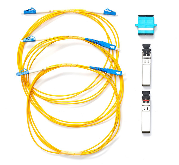 10G SFP+ Singlemode WDM Modul Kit 1270/1330 nm Bidirektional - 10GBase-BX10 1270/1330 nm SFP Transceiver, Übertragungsstrecke bis zu 10 km, mit LC-SC Simplex SM Patch-Kabel, LC-LC Simplex SM Patch-Kabel und SC-SC-Adapter.