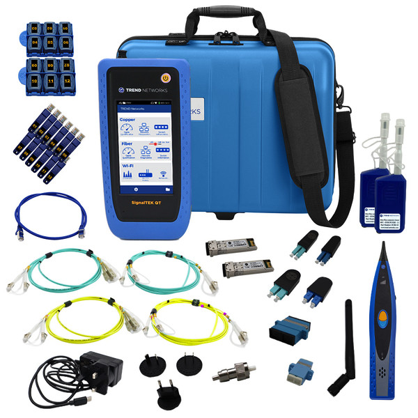 SignalTEK QT Pro Bundle - 10G Kupfer-/Glasfaser-/WIFI-Qualifizierungstester mit erweiterter Garantie, Zubehör und Hartschalenkoffer. Der SignalTEK QT Pro 10-Gigabit-Qualifizierungstester ist die Testlösung zur Überprüfung von Kupfer-, Glasfaser- und WiFi-Verbindungen. Er testet die Kabelleistung anhand von frequenzbasierten Messungen und überprüft, ob die gewünschte Netzwerkgeschwindigkeit unterstützt wird. Er zeigt die verfügbare Leistung im Vergleich zur gewünschten Geschwindigkeit auf einem leicht zu lesenden Display an und es stehen die Geschwindigkeiten von 10 Mb/s bis 10 Gb/s einschließlich der neuen 2,5 und 5 Gb/s Multigeschwindigkeiten zur Auswahl. Der SignalTEK QT Pro qualifiziert zusätzlich Glasfaserverbindungen gemäß IEEE 802.3 Standard bis zu 100 Gb/s durch Messung der Einfügedämpfung und Länge der Glasfaserverkablung mit einem Loopback-Test. Die High-Performance SFP-Module von TREND bieten präzise Einfügedämpfungsmessungen, der SignalTEK QT Pro erkennt das installierte SFP-Modul, um automatisch PASS/FAIL-Grenzwerte festzulegen. Analysieren Sie die WiFi-Kanalstärke und identifizieren Sie die Zugangspunkte, die sich auf überlappenden Kanälen befinden, um die Leistung des Netzwerks zu maximieren. Graphen zur Kanalauslastung helfen dabei die Access-Points (APs) mit Benutzern festzustellen, die überlastet sind. Verbunden mit dem Netzwerk können Diagnosen mit Ping-, Traceroute- und Device-Scan-Tests durchgeführt werden. Er führt einen Lasttest mit bis zu 90 Watt aus, um sicherzustellen, dass die von der Switch bereitgestelle Leistung auch über die installierten Kabeln genügend Strom für die PoE-Geräte liefern und die Ergebnisse mit PASS/FAIL bewerten werden. Mit dem NetScan erfassen Sie eine Liste mit den angeschlossen Geräten einschließlich Hersteller-ID, IP-Adresse und MAC-Adresse mit automatischer Prüfung auf IP-Adressenkonflikte und lokalisieren mit der internen oder externen Antenne den Standort der Zugangspunkte. Das Managementsystem TREND AnyWARE Cloud ermöglicht die Echzeitzusammenarbeit zwischen Projektmanager und Servicetechniker, Vorkonfiguration von Testeinstellungen, kostenlosen Speicherplatz, müheloses Lokalisieren von Projektdateien, teilen von Links zu den Testberichten und Fleet-Manager Geräteverwaltungssystem. Der SignalTEK QT PRO unterstützt neben den kompletten Leistungsumfang der Kupfer- und Glasfaserqualifizierung sowie das Testen von WiFi den Live-Verdrahtungstest mit sofortigen Verdrahtungs-Ergebnis, Anschlussmöglichkeit für Glasfaser-Inspektionsmikroskop zum Prüfen der Steckerqualität und automatischen PASS/FAIL-Bewertung nach IEC-61300-3-35 Standard, integrierte rote Laserquelle zur Überprüfung der Polarität und Erkennung von Brüchen und Biegeradien von Patchleitungen, Li-Polymer-Akku mit einer Betriebszeit von bis zu 10 Stunden. Das Kit beinhaltet zusätzlich die Remoteadapter-Sets Nr. 1-12 mit RJ45-Stecker- und Buchsenanschluss zur Verdrahtungsprüfung für einen effizienten Einsatz beim Testen im Ein-Mann-Betrieb, SFP+ High Stability 850 nm MM-Modul und 1310 SM-Modul, LC und SC Glasfaser-Loopback-Adapter für MM und SM und einen abschließbaren Hartschalenkofer.