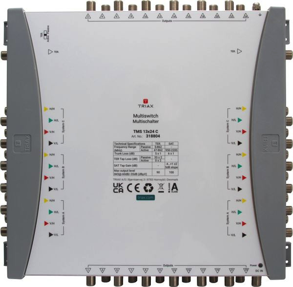 Kaskaden-Multischalter für drei Satellitenpositionen mit 13 Eingängen und 24 Ausgängen, geeignet für die Verteilung von Satelliten- und terrestrischen Signalen. Einfache und schnelle Installation durch farbliche Markierung aller Ein-/Ausgänge und einem kompakten, platzsparendem Gehäuse. Mit allen Kaskaden-Bausteinen der TMS13-Serie über Steckverbinder kombinierbar. Terrestrische Verteilung wahlweiße passiv oder aktiv.