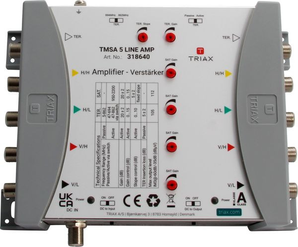 Vor- und Nachverstärker für CKR/TMS 5x Multischalter-Systeme. Der TMS 5 LINE AMP dient als Vor- und Nachverstärker mit Pegelsteller in Kaskadensystemen. Die Stromversorgung für den Verstärker erfolgt über ein separates Netzteil (TMS PSU 1.2A).