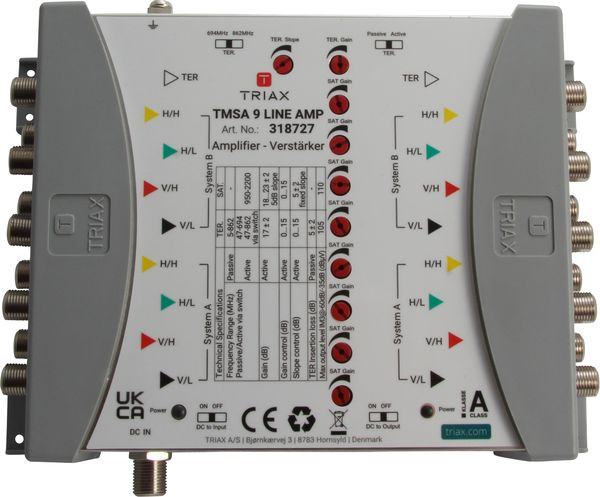 Vor- und Nachverstärker für CKR/TMS 9x Multischalter-Systeme. Der TMS 9 LINE AMP dient als Vor- und Nachverstärker mit Pegelsteller in Kaskadensystemen. Die Stromversorgung für den Verstärker erfolgt über ein separates Netzteil (TMS PSU 2A oder 3A).