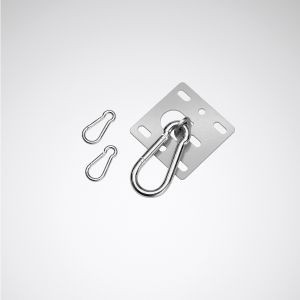 Deckenbefestigungsplatte mit 3 Karabinerhaken. In Kombination mit separat zu bestellender Gliederkette zur abgehängten Montage der Leuchte an Decken.