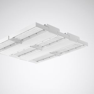 Robuster LED-Hallenstrahler. Geeignet zur Anwendung in HACCP, IFS und/oder BRC Global Standard Food zertifizierten Unternehmen. Mit begrenzter Oberflächentemperatur, für den Einsatz in feuergefährdeten Räumen gemäß DIN EN 60598-2-24 geeignet. Zur Deckenmontage sowie abgehängten Montage über optionales Zubehör geeignet. Optisches System aus einer PC-Linsenoptik zusammengesetzt. Mit symmetrisch eng strahlender Lichtstärkeverteilung. Leuchtenlichtstrom und Lichtfarbe fest eingestellt. LED-System bestehend aus 6 LED-Modulen, auf Aluminiumträger montiert. Bemessungslichtstrom 53300 lm, Bemessungsleistung 298 W, maximale Leuchten-Lichtausbeute 179 lm/W. Lichtfarbe neutralweiß, ähnlichste Farbtemperatur (CCT) 4000 K, allgemeiner Farbwiedergabeindex (CRI) Ra > 80. Farborttoleranz (initial MacAdam) = 3 SDCM. Mittlere Bemessungslebensdauer L80 (tq 45 °C) = 100.000 h., Mittlere Bemessungslebensdauer L90 (tq 45 °C) = 50.000 h. Flimmern: Pst LM = 1,0 bei Volllast. Stroboskop-Effekt: SVM = 0,4 bei Volllast. Robuster Aluminium-Druckguss-Körper mit integrierten Kühlrippen. Oberfläche weiß beschichtet (ähnlich RAL 9016). Maße (L x B): 649 mm x 559 mm, Leuchtenhöhe 63 mm. Schutzklasse (EN 61140): I, Schutzart (DIN EN 60529): IP65, Stoßfestigkeitsgrad nach IEC 62262: IK08, Prüftemperatur Glühdrahttest gemäß IEC 60695-2-11: 850 °C. Zulässige Umgebungstemperatur (ta): -30 °C bis 45 °C. Gewicht: 12,0 kg. Mit 5-poliger Anschlussleitung 5 x 0,75 mm2 (1500 mm). Mit 2 elektronischen Betriebsgeräten, digital dimmbar (DALI). Betriebsgerät gemäß DALI-2-Standard (EN 62386). Leuchte mittels Tastfunktion über DALI-Steuerklemmen schalt- und dimmbar (Touch DIM). Das Betriebsgerät ist entsprechend der Ökodesign-Anforderungen (VO (EU) 2019/2020) austauschbar. Die Leuchte ist Monitoring ready (MOR) und liefert Leuchtendaten zur Überwachung oder vorausschauenden Wartung. Sie ist damit kompatibel zu den TRILUX Monitoring Services. Das Produkt erfüllt die grundlegenden Anforderungen der anwendbaren EU-Richtlinien und des Produktsicherheitsgesetzes und trägt die CE-Kennzeichnung. Zusätzlich ist die Leuchte durch eine unabhängige Prüfstelle ENEC-zertifiziert. Leuchte 10 Jahre, Ersatzteil Betriebsgerät 15 Jahre nach Rechnungsdatum unter Vorbehalt vertretbarer Änderungen, die dem Fortschritt dienen, verfügbar. Ersatzteile LED-Modul und optisches System sind bauartbedingt nicht verfügbar.