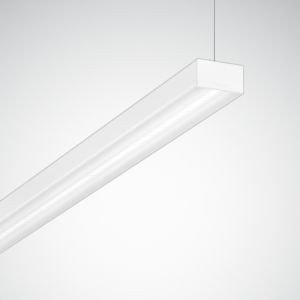 LED-Hängeleuchte für Einzel- oder Lichtbandanwendungen. Für abgehängte Montage. Als Einzelleuchte oder in Lichtbandanwendung. Optisches System in Micro-Reflektor-Technology (MRWD) mit hocheffizienten, weiß-polierten Reflektorkammern aus Kunststoff mit Diffusorscheibe für ein gleichmäßig ausgeleuchtetet Lichtbild mit höchstem Sehkomfort. Mit zusätzlicher, im optischen System integrierten, klaren Abdeckscheibe für raumseitig flächenbündigen Abschluß und Schutz der LED. Dezente seitliche Lichtauskopplung über die gesamte Leuchtenlänge. Mit lambertscher Lichtstärkeverteilung. Mit innovativem, lichttechnisch wirksamen PMMA-Lichtkuppeln für die Lichtauskopplung des Indirektanteils. Leuchtenlichtstrom und Lichtfarbe fest eingestellt. LED-System und Leuchtenoptik als Baugruppe werkzeuglos in Leuchtenkörper einzurasten. Baugruppe mit Stahlseil vor Absturz bei Montage gesichert. Bemessungslichtstrom 6000 lm, Bemessungsleistung 48 W, maximale Leuchten-Lichtausbeute 125 lm/W. Lichtfarbe warmweiß, ähnlichste Farbtemperatur (CCT) 3000 K, allgemeiner Farbwiedergabeindex (CRI) Ra > 80. Farborttoleranz (initial MacAdam) = 3 SDCM. Mittlere Bemessungslebensdauer L80 (tq 25 °C) = 50.000 h. Die Lichtquelle ist entsprechend der Ökodesign-Anforderungen (VO (EU) 2019/2020) austauschbar. Flimmern: Pst LM = 1,0 bei Volllast. Stroboskop-Effekt: SVM = 0,4 bei Volllast. Leuchtenkörper aus Stahlblech. Oberfläche weiß beschichtet (ähnlich RAL 9016). Maße (L x B): 1413 mm x 84 mm, Leuchtenhöhe 45 mm. Schutzklasse (EN 61140): I, Schutzart (DIN EN 60529): IP20, Stoßfestigkeitsgrad nach IEC 62262: IK03, Prüftemperatur Glühdrahttest gemäß IEC 60695-2-11: 650 °C. Zulässige Umgebungstemperatur (ta): -20 °C bis 25 °C. Gewicht: 4,2 kg. Netzseitiger Anschluss erfolgt mittels Steckklemmen. Elektrische Verbindung der Baugruppen erfolgt selbständig. Mit elektronischem Betriebsgerät, digital dimmbar (DALI). Betriebsgerät gemäß DALI-2-Standard (EN 62386). Leuchte mittels Tastfunktion über DALI-Steuerklemmen schalt- und dimmbar (Touch DIM). Das Betriebsgerät ist entsprechend der Ökodesign-Anforderungen (VO (EU) 2019/2020) austauschbar. Die Leuchte ist Monitoring ready (MOR) und liefert Leuchtendaten zur Überwachung oder vorausschauenden Wartung. Sie ist damit kompatibel zu den TRILUX Monitoring Services. Das Produkt erfüllt die grundlegenden Anforderungen der anwendbaren EU-Richtlinien und des Produktsicherheitsgesetzes und trägt die CE-Kennzeichnung. Zusätzlich ist die Leuchte durch eine unabhängige Prüfstelle ENEC-zertifiziert. Leuchte 10 Jahre, Ersatzteile (LED-Modul, Betriebsgerät, optisches System) 15 Jahre nach Rechnungsdatum unter Vorbehalt vertretbarer Änderungen, die dem Fortschritt dienen, verfügbar.
