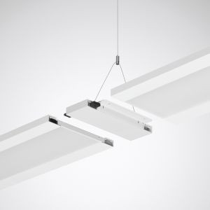Mechanischer und elektrischer Verbinder zur Gliederung eines abgehängten Lichtbands. Für Hängeleuchten der Baureihe Luceos. Aus Stahlblech, weiß pulverbeschichtet. Maße (L x B): 144 mm x 240 mm, H = 22,4 mm. Triangel-Seilabhängung bereits im Lieferumfang enthalten.