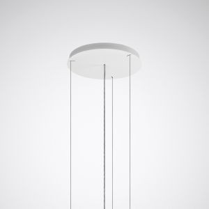 Pendelset für abgehängte Montage Für DALI dimmbare Leuchten. (5 x 0,75 mm2). Für Abhängelängen bis 6000 mm. Bestehend aus einem weißen Deckenbaldachin, einer transparenten Netzzuleitung sowie einer 3-Punkt Seilabhängung mit Befestigungsstücken, (ähnlich RAL 9016).