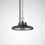 Runder LED-Hallenstrahler für abgehängte Montage. Geeignet zur Anwendung in HACCP, IFS und/oder BRC Global Standard Food zertifizierten Unternehmen. Mit begrenzter Oberflächentemperatur, für den Einsatz in feuergefährdeten Räumen gemäß DIN EN 60598-2-24 geeignet. Für abgehängte Montage als Einzelleuchte. Ein-Punkt-Aufhängung an mittig angeordnetem Schraubhaken. Montagezubehör als separat zu bestellendes Zubehör verfügbar. Optisches System mit PC-Linsentechnik. Mit einer Optikeinheit pro LED-Modul. Mit symmetrisch breit strahlender Lichtstärkeverteilung. Leuchtenlichtstrom und Lichtfarbe fest eingestellt. Bemessungslichtstrom 30000 lm, Bemessungsleistung 200 W, maximale Leuchten-Lichtausbeute 150 lm/W. Lichtfarbe neutralweiß, ähnlichste Farbtemperatur (CCT) 4000 K, allgemeiner Farbwiedergabeindex (CRI) Ra > 80. Farborttoleranz (initial MacAdam) = 5 SDCM. Mittlere Bemessungslebensdauer L80 (tq 25 °C) = 50.000 h. Die Lichtquelle ist entsprechend der Ökodesign-Anforderungen (VO (EU) 2019/2020) austauschbar. Flimmern: Pst LM = 1,0 bei Volllast. Stroboskop-Effekt: SVM = 0,4 bei Volllast. Robustes Druckgussgehäuse mit integrierten Kühlrippen. Oberfläche schwarz beschichtet (ähnlich RAL 9005). Leuchtendurchmesser 310 mm, Leuchtenhöhe 173 mm. Schutzklasse (EN 61140): I, Schutzart (DIN EN 60529): IP65, Stoßfestigkeitsgrad nach IEC 62262: IK08, Prüftemperatur Glühdrahttest gemäß IEC 60695-2-11: 650 °C. Zulässige Umgebungstemperatur (ta): 40 °C . Gewicht: 1,9 kg. Mit elektronischem Betriebsgerät, digital dimmbar (DALI). Betriebsgerät gemäß DALI-2-Standard (EN 62386). Das Betriebsgerät ist entsprechend der Ökodesign-Anforderungen (VO (EU) 2019/2020) austauschbar. Das Produkt erfüllt die grundlegenden Anforderungen der anwendbaren EU-Richtlinien und des Produktsicherheitsgesetzes und trägt die CE-Kennzeichnung. Zusätzlich ist die Leuchte durch eine unabhängige Prüfstelle ENEC-zertifiziert.