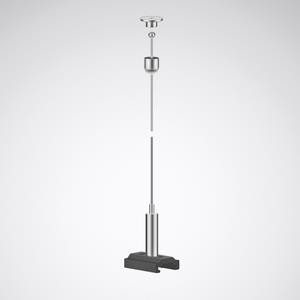 Seilabhängung für Abhängelängen bis: 1500 mm. Geeignet für Anbau-Stromschienen. Bestehend aus einem verzinktem Stahlseil Ø 1,5 mm und Aufhängeklammer aus Edelstahl. Farbe schwarz (ähnlich RAL 9005). Maße (L x B x H): 90 mm x 90 mm x 18 mm.