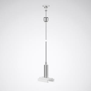 Seilabhängung für Abhängelängen bis: 3000 mm. Geeignet für Anbau-Stromschienen. Bestehend aus einem verzinktem Stahlseil Ø 1,5 mm und Aufhängeklammer aus Edelstahl. Farbe weiß (ähnlich RAL 9016). Maße (L x B x H): 90 mm x 90 mm x 18 mm.