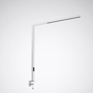Standleuchte mit direktem und indirektem Lichtstromanteil. Mit PIR-Sensor und Wireless-Steuergerät, ZigBee-Mesh-Netzwerk. Die Bedienung erfolgt über ein im Standprofil flächenbündig eingelassenes Bedienfeld. Mit integriertem Bewegungs- und Tageslichtsensor. Nach 15 Minuten ohne Bewegungserkennung wird die Leuchte ausgeschaltet. Der Tageslichtsensor ermöglicht bei Aktivierung ein konstantes Helligkeitsniveau im Umfeld der Leuchte. Der Helligkeits-Referenzwert kann mittels Bedienfeld verändert und abgespeichert werden. Ein Drehschalter ermöglicht die Einstellung und Kombination der Lichtmanagement-Betriebsarten (Bewegungs-Sensor Ein/Aus, Tageslichtsensor Ein/Aus). Mit Tischklemme zur Befestigung der Leuchte am Rand einer massiven, tragfähigen Oberfläche mit einer Materialstärke von 20 mm - 75 mm und ca. 100 mm Klemmtiefe. Die Leuchte ist um 180° drehbar. Die Oberfläche des Befestigungsbereiches ist durch Gummipuffer geschützt. Die Lieferung der Leuchte erfolgt zum Schutz der Einzelkomponenten in 2 Packstücken. Mit symmetrisch begrenzt breit strahlender Lichtstärkeverteilung. Blendungsbewertung nach UGR-Einstufung (EN 12464-1) < 19. Leuchtenlichtstrom und Lichtfarbe fest eingestellt. Bemessungslichtstrom 12400 lm, Bemessungsleistung 80 W, maximale Leuchten-Lichtausbeute 155 lm/W. Lichtfarbe neutralweiß, ähnlichste Farbtemperatur (CCT) 4000 K, allgemeiner Farbwiedergabeindex (CRI) Ra > 80. Farborttoleranz (initial MacAdam) = 3 SDCM. Mittlere Bemessungslebensdauer L80 (tq 25 °C) = 50.000 h. Die Lichtquelle ist entsprechend der Ökodesign-Anforderungen (VO (EU) 2019/2020) austauschbar. Flimmern: Pst LM = 1,0 bei Volllast. Stroboskop-Effekt: SVM = 0,4 bei Volllast. Linearer, filigraner Leuchtenkörper. Bestehend aus Leuchtenkopf, Standprofil und Tischklemme. Aus Aluminium, pulverbeschichtet. Oberfläche weiß beschichtet (ähnlich RAL 9016). Maße des Leuchtenkopfes (L x B x H): 1239 mm x 52 mm, Leuchtenhöhe: 1269 mm. Leuchtenkopf und Standprofil in rechteckiger Ausführung. Zulässige Umgebungstemperatur (ta): 25 °C Gewicht: 4,0 kg. Anschluss mittels flexibler Anschlussleitung. Länge ca. 3000 mm. Schutzkontaktstecker kompatibel mit Steckdosen vom Typ E und Typ F. Steckerausführung: abgewinkelt. Mit elektronischem Betriebsgerät, dimmbar (integriert). Das Betriebsgerät ist entsprechend der Ökodesign-Anforderungen (VO (EU) 2019/2020) austauschbar. Das Produkt erfüllt die grundlegenden Anforderungen der anwendbaren EU-Richtlinien und des Produktsicherheitsgesetzes und trägt die CE-Kennzeichnung.