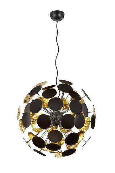 Ein modernes Accessoire für Ihr Wohn- oder Schlafzimmer. Das auffällige Design der Pendelleuchte ist garantiert ein echter Hingucker! Im eingeschalteten Zustand bietet sie ein gelungenes Zusammenspiel zwischen Design und Schatten. Mit ein wenig Fantasie erinnert die Leuchte an eine Pusteblume und passt genau deshalb zu einem kreativen Einrichtungsstil. Die Leuchte hat eine Abhängelänge von 150 cm und einen Durchmesser von 54 cm. Während die Kunststoffscheiben von außen in einem Schwarz matt gehalten sind, erstrahlt die Innenseite der Scheiben in Gold. Diese Farbkombination kreiert eine nuancenreiche Lichtstimmung im Raum. Für eine moderne und zuverlässige Beleuchtung empfiehlt sich die Verwendung eines LED-Leuchtmittels. Es bietet eine hohe Lichtqualität, ist vielseitig einsetzbar und überzeugt durch gleichmäßige Ausleuchtung. Seine lange Lebensdauer und geringe Wärmeentwicklung machen es zur idealen Wahl für verschiedenste Anwendungen.