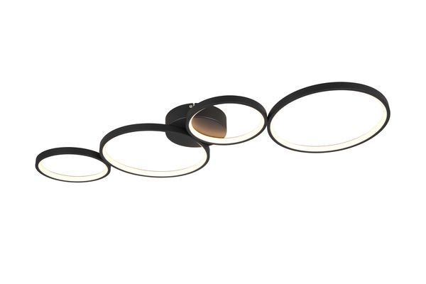 Mit ihren vier aneinander hängenden Ringen unterschiedlichen Durchmessers, ist die Deckenleuchte RONDO ein echter Eyecatcher. Die Deckenleuchte verfügt über einen integrierten Dimmer, der über den Lichtschalter gesteuert wird. Damit lässt sich die Helligkeit der in den jeweiligen Kreis-Innenseiten verbauten LEDs flexibel steuern. Die 97 cm breite Deckenleuchte ist ein wahres Deko-Element und wertet jeden Wohnraum stilvoll auf. Dank der Farbgestaltung in Schwarz matt, kann die Leuchte mit vielen Einrichtungsstilen kombiniert werden. Darüber hinaus verfügt die Leuchte über eine moderne LED Technologie, die sich durch eine hohe Lichtqualität und Energieeffizienz auszeichnet. Im Vergleich zu herkömmlichen Halogen Leuchtmitteln lassen sich bis zu 80% der Energiekosten sparen. Zusätzlich haben LED Lichtquellen eine lange Lebensdauer, produzieren weniger Wärme und schonen die Umwelt. Über Lichtschalter dimmbar. LED nicht tauschbar