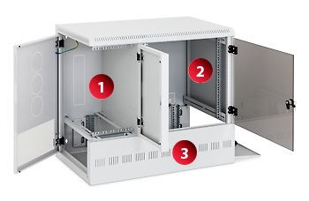Die dritte Sektion umfasst die ganze Fläche des Bodens des Gehäuses. Hier ist Raum für Komponenten mit einer maximalen Tiefe von 800 mm, einer Breite von 19“ und einer Höhe von 2 bis 7HE je nach Gehäusetyp. Der Zugriff auf diese Sektion erfolgt durch die Tür auf der rechten Seite. Nebem dem Verteiler muss genügend Abstand für den Auszug von Komponenten gelassen werden.