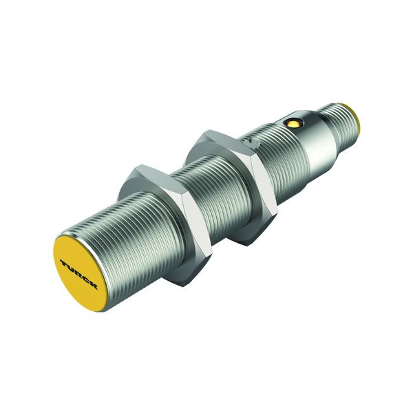 Kapazitiver Sensor, Bemessungsschaltabstand 5 mm, Einbaubedingungen bündig, Gewinderohr, M18 x 1, Messing verchromt, Festabgleich, DC 3-Draht, 10…65 VDC, Öffner, PNP-Ausgang, Steckverbinder, M12 x 1
