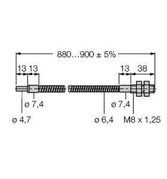 Glas-Lichtleiter, Einzelleiter, Betriebsart: Einweglichtschranke, Edelstahlummantelung, flexibel, Betriebstemperatur Lichtleitermantel: -140…+249 °C, Fühler-Endhülse: Gewinde M8 x 1,25, Lichtleiter-Bündeldurchmesser: 3.2 mm, Gesamtlänge des Lichtleiters: ± 914 mm