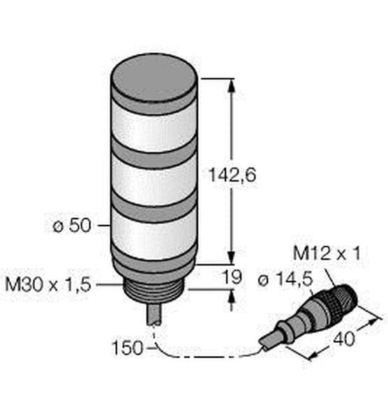 LED-Signalleuchte, Signalsäule, Leitungslänge0,15 m, Schwarzes Kunststoffgehäuse, Schutz gegen elektromagnetische und hochfrequente Störungen, Schutzart IP67, Kabel mit Stecker M12X1, 150 mm, Farben: Grün (COL 1) / Gelb (COL 2) / Rot (COL 3), Betriebsspannung: 18…30 VDC oder 24 VAC bei jeweils 45mA pro LED-Farbe, Eingänge: PNP / NPN
