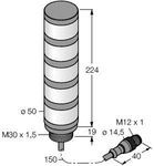 LED-Signalleuchte, Signalsäule, Leitungslänge0,15 m, Schwarzes Kunststoffgehäuse, Schutz gegen elektromagnetische und hochfrequente Störungen, Schutzart IP67, Kabel mit Stecker M12X1, 150 mm, Farben: Weiß (COL 1) / Blau (COL 2) / Grün (COL 3) / Gelb (COL 4) / Rot (COL 5), Betriebsspannung: 18…30 VDC oder 24 VAC bei jeweils 45mA pro LED-Farbe, Eingänge: PNP / NPN