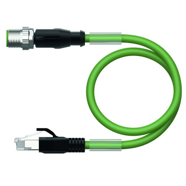 Leitung für Industrial Ethernet / PROFINET, Verbindungsleitung, Bemessungsspannung 30 V, Leitungslänge1 m, Ethernet-Leitung: 4-polig, AWG 22, CAT 5E, Mantelmaterial: PUR, Mantelfarbe: grün, Schirm: Aluminiumfolie überlappend, Kupferdraht verzinnt, Manteldurchmesser: 6.5 mm, schleppkettentauglich, ölbeständig nach IEC 60811-2-1 und UL13, halogenfrei nach IEC 60754, flammwidrig nach IEC 60332-1-2 und UL2556 VW1, Zulassung: UL, RoHS-konform, PNO-konform, RJ45-Stecker, gerade, 4-polig, M12-Stecker, gerade, D-codiert, Leitungslänge: 1.0 Meter