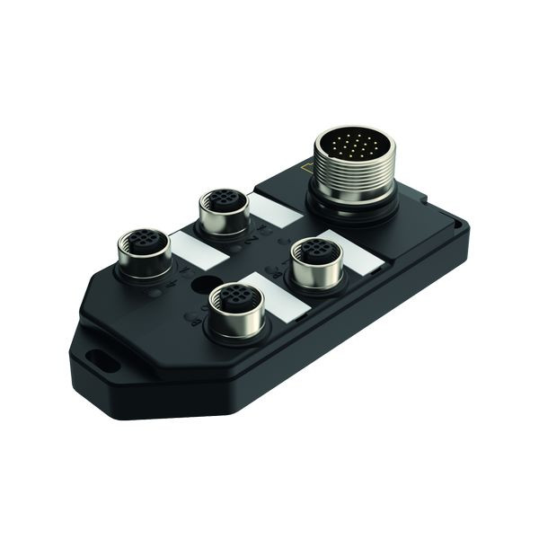 Passiver Aktuator-/Sensor-Verteiler M12 x 1, 4-fach, mit M23-Steckverbinder für die Zuleitung, Bemessungsspannung 30 V, Gehäusematerial: Nylon, Gehäusefarbe: schwarz, Schutzart IP67, RoHS-konform, CE-konform, E/A-Steckplatz (Polzahl): 3-polig + PE