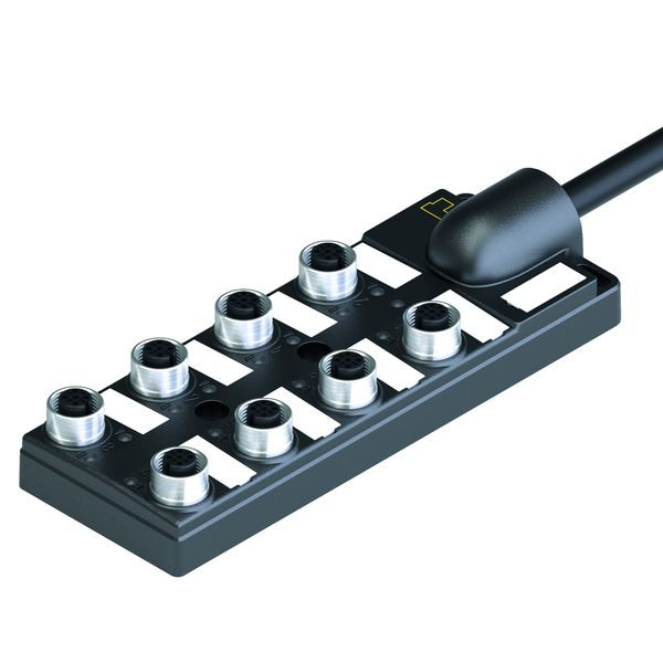 Passiver Aktuator-/Sensor-Verteiler M12 x 1, 8-fach, mit fest angeschlossener Leitung, Bemessungsspannung 30 V, Leitungslänge2 m, Gehäusematerial: Nylon, Gehäusefarbe: schwarz, Schutzart IP67, RoHS-konform, CE-konform, E/A-Steckplatz (Polzahl): 3-polig + PE