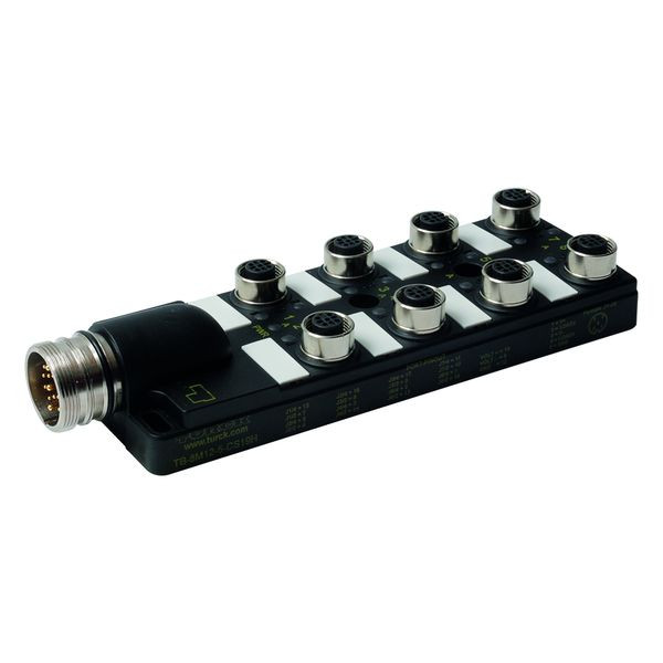 Passiver Aktuator-/Sensor-Verteiler M12 x 1, 8-fach, mit M23-Steckverbinder für die Zuleitung, Bemessungsspannung 30 V, Gehäusematerial: Nylon, Gehäusefarbe: schwarz, Schutzart IP67, RoHS-konform, CE-konform, E/A-Steckplatz (Polzahl): 4-polig + PE