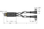 Zweifachverteiler, Y-Verteiler mit Leitung, Kupplung M12x1 - 2x Stecker Ø8mm, Bemessungsspannung 48 V, Leitungslänge1,5 m, Mantelmaterial: PVC, Mantelfarbe: schwarz, Chemikalien- und ölbeständig, Flammwidrig, Beständig gegen Säuren und Laugen, Mikroben- und hydrolysefest, LABS-frei, RoHS-konform, Schutzart IP67, 4/3-polig, Leitungslänge: 1.5 / 1.5 Meter