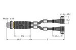 Zweifachverteiler, Y-Verteiler mit Leitung, Stecker M12x1 - 2x Kupplung Ø8mm, Bemessungsspannung 60 V, Leitungslänge2 m, Mantelmaterial: PVC, Mantelfarbe: schwarz, Chemikalien- und ölbeständig, Flammwidrig, Beständig gegen Säuren und Laugen, Mikroben- und hydrolysefest, LABS-frei, RoHS-konform, Schutzart IP67, 4/3-polig, Leitungslänge: 2.0 / 2.0 Meter