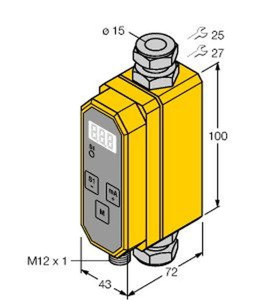 Durchflussmessung, Inline-Sensor mit integrierter Auswerteelektronik, Einbaubedingungen Inline-Sensor, Programmierbarer Durchflussmesser für elektrisch leitfähige Flüssigkeiten, Magnetisch-induktives Prinzip, Anzeige und Überwachung des Durchflusses, 3-stellige Anzeige in [l/min], Messwertabweichung 0...10l/min: <+/-0,2 l/min, Messwertabweichung 10...80l/min: <+/-2% v. Mw., Mindestleitfähigkeit > 20 µS/cm (Wasser > 30 µS/cm), Programmierung über Taster und durch Zugangscode geschützt, DC 4-Draht, 21.6...26.4 VDC, Öffner/Schließer prog., PNP-Ausgang, 4...20 mA Analogausgang, Analogausgang liefert einen dem Durchfluss proportionalen Strom im gesamten Arbeitsbereich, Steckergerät, M12 x 1