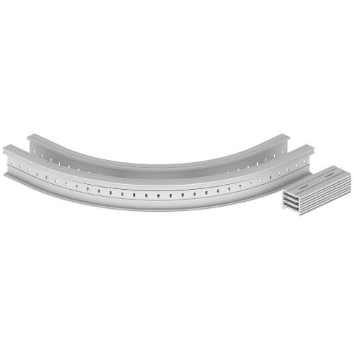 Flachbogen zur Ausführung von 90°-Drehungen. Es wird empfohlen, Träger unter den Bogen anzubringen. Krümmungsradius von 600 mm. Stoßstellenverbinder sind zur einfachen Montage im Lieferumfang enthalten. Isolierendes Material. Farbe: Lichtgrau RAL 7035