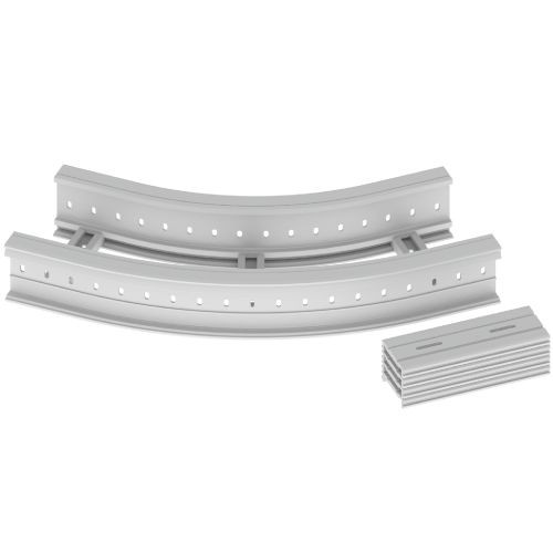 Flachbogen zur Ausführung von 45°-Drehungen. Es wird empfohlen, Träger unter den Bogen anzubringen. Krümmungsradius von 600 mm. Stoßstellenverbinder sind zur einfachen Montage im Lieferumfang enthalten. Isolierendes Material. Farbe: Lichtgrau RAL 7035