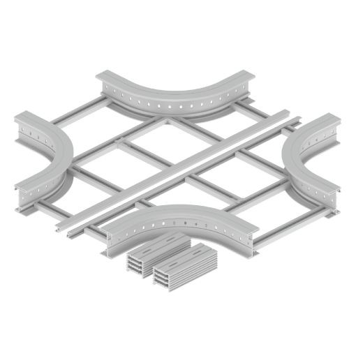 Element zur Ausführung von Kreuzungen zwischen zwei Kabelleiterabschnitten mit einem Krümmungsradius von 300 mm. Stoßstellenverbinder sind zur einfachen Montage im Lieferumfang enthalten. Isolierendes Material. Farbe: Lichtgrau RAL 7035